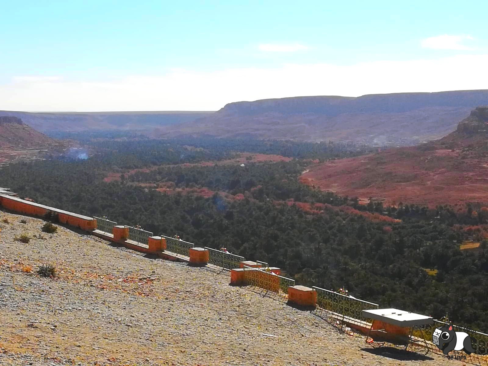 →La siguiente parada la hacemos en el Café vue panoramique, desde el que hay unas vistas impresionantes al Palmeral del valle del Ziz. Este mirador, está relativamente cera de Errachidia.